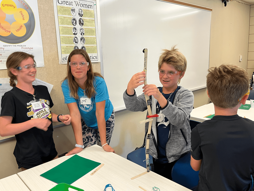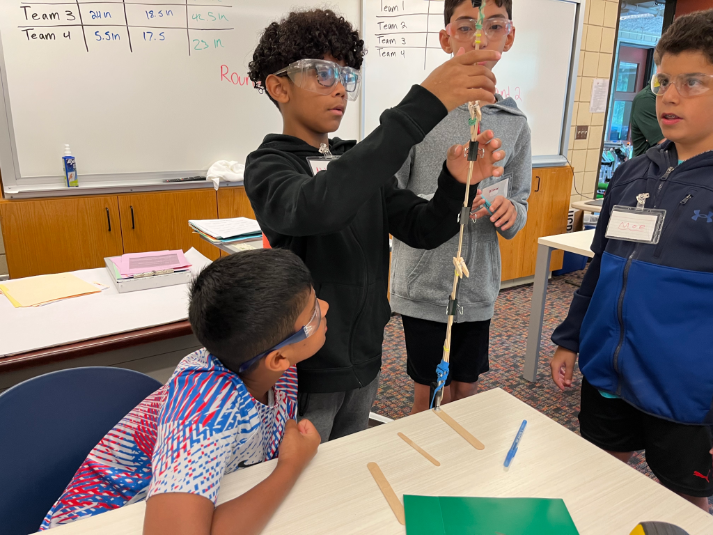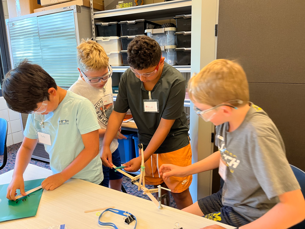 Our first challenge on day one was to build a structure out of popsicle sticks and other assorted materials. Campers aimed to make their structures reach as far and as high as possible. After the first round they would look at every other groups’ ideas and then do a second round of the competition using strategies they learned from other teams. This helped the kids learn two important things: first the value of Coopertition, which means that while yes all the teams were competing, it’s still important to be gracious, to help and to learn from your competitors. The campers also learned that iterating on your design is constant in robotics, and it’s okay, and sometimes necessary, to restart from the ground up to create the best product in the end.