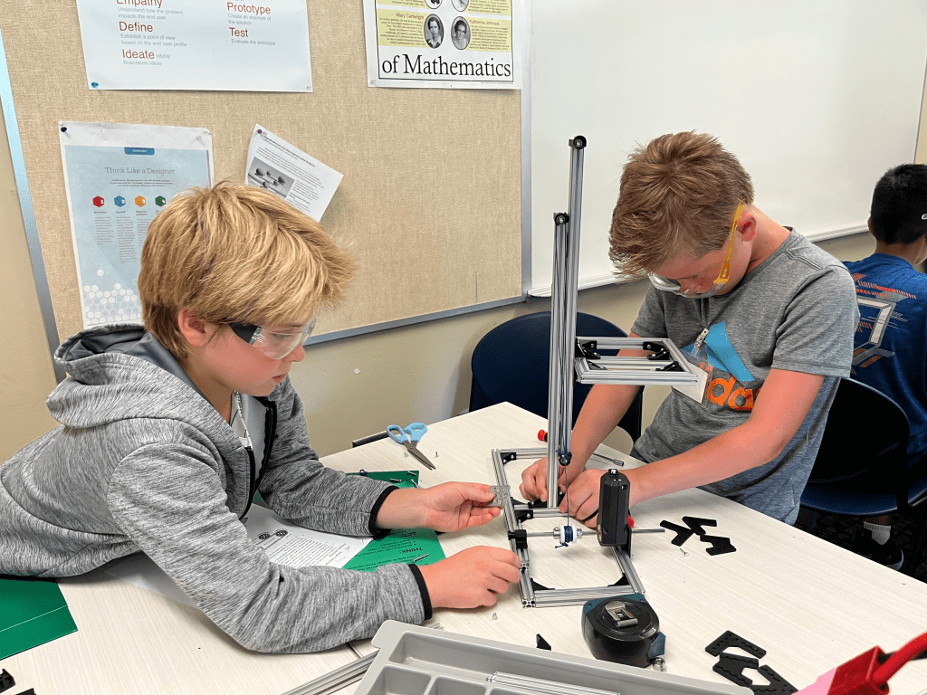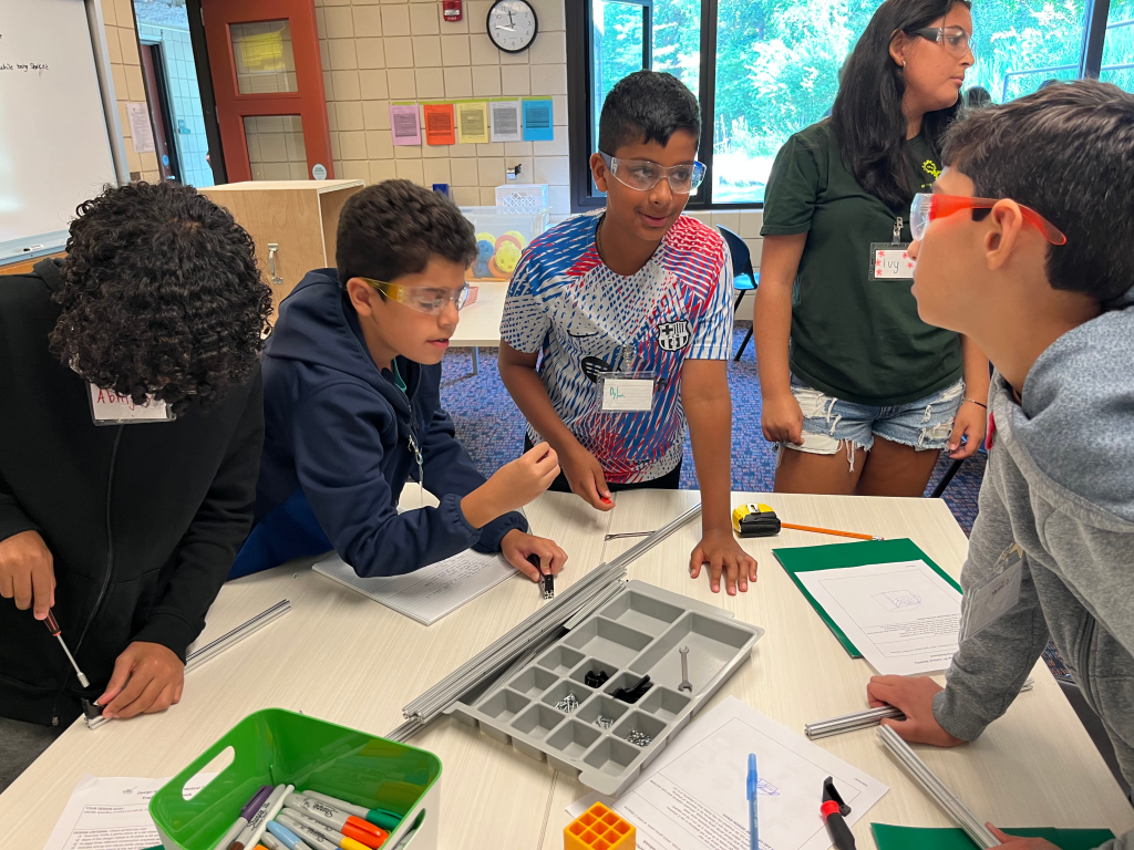 The second challenge campers worked on during day one was to create a structure out of aluminum vex kit bars. The structure had to hold a cube 18 inches off the ground, and hold it in place after being shook on a table. These requirements were met by all teams! This activity served as an introduction into the metal pieces, the stationary brackets, the nuts, bolts, and the tools that we would be using throughout the week. It also gave campers a chance to practice reading directions, and identifying their goals, and constrictions in a challenge.