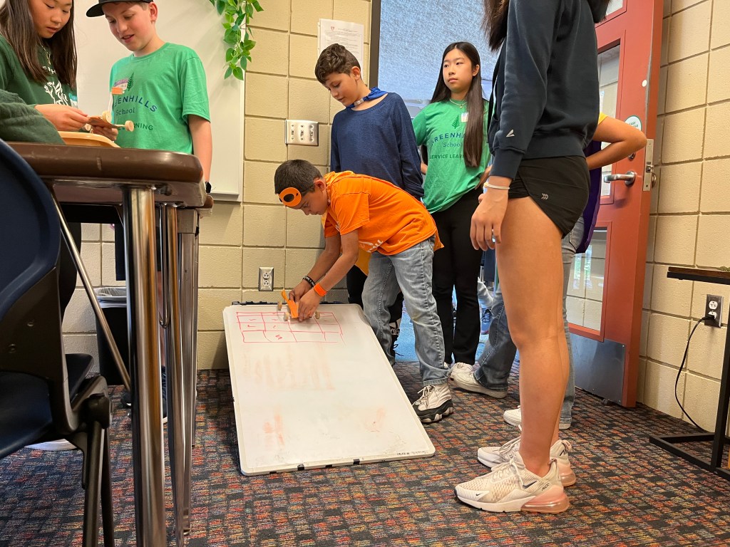 This year our robotics team participated in our Greenhills’ all school service day. Members from our Upper school, and our Middle-school teams spent the day helping run our STEAM (Science, Technology, Engineering, Art, Math) themed station. This year for service day Greenhills hosted students from Maybury Elementary. Maybury students who came to Greenhills were assigned a Greenhills buddy to spend the day with, and become pen pals with later in the year. Our station worked with 75 of these pairs, in 3 groups of 25 at a time.