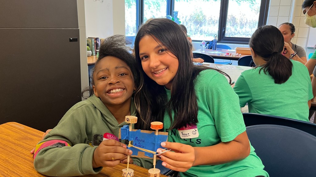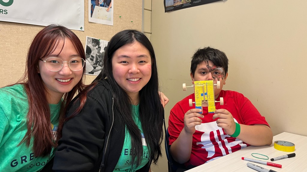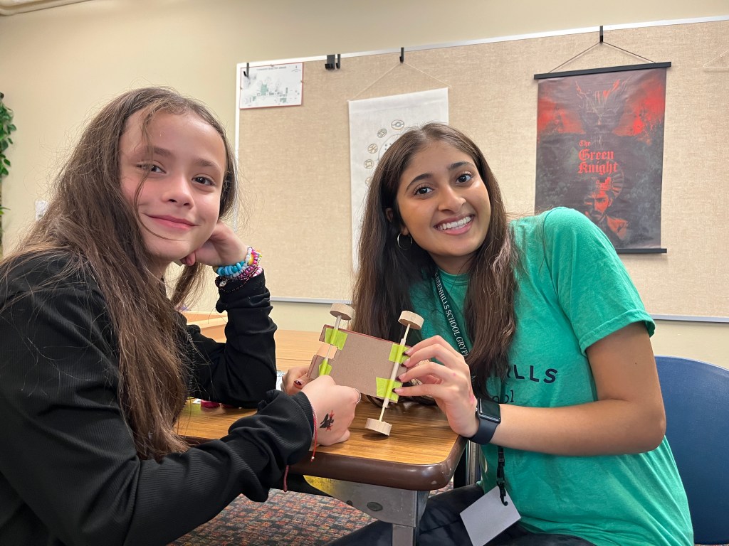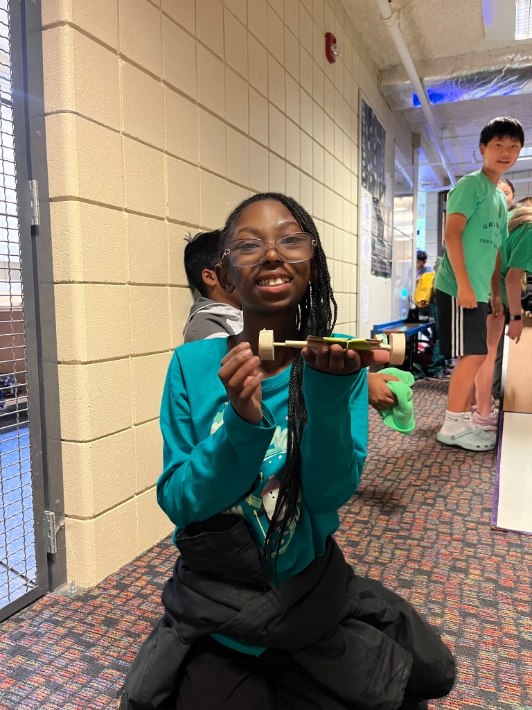 Students first were brought to the Junior forum where they were told the plan of the day. They then got to see the 9895 team robot for this year’s FIRST robotics game, Center Stage. Students saw the robot drive around, use its airplane launcher, and place game pieces on a backdrop. Pairs then went downstairs into the design wing, where they began the main event of our station, creating their own Elastic Energy Supercar! Using all renewable resources, these student pairs each created a Supercar that the Maybury students then got to take home! Students also got to race their cars against each other on the tracks we had set up in the hallway.